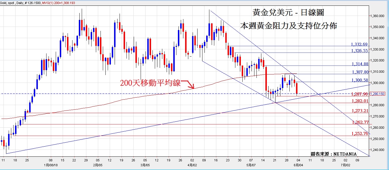 当意大利政局危机舒缓后,周五晚美国公布了就业数据,强劲的非农数据结果(预测:19万, 结果:22.3万),令10年期债息周五晚急升,由2.8% 升上2.9%,升回接近3%心理关口水平,提振了美元汇价,相信本周,若果债息再次升穿3%的话,将令美元汇价飙升,金价及其他外币价格将会持续下跌。 下周三(6月13日)是美国联储局议息日 ,所以本周要再度紧贴留意10年期债息走势。