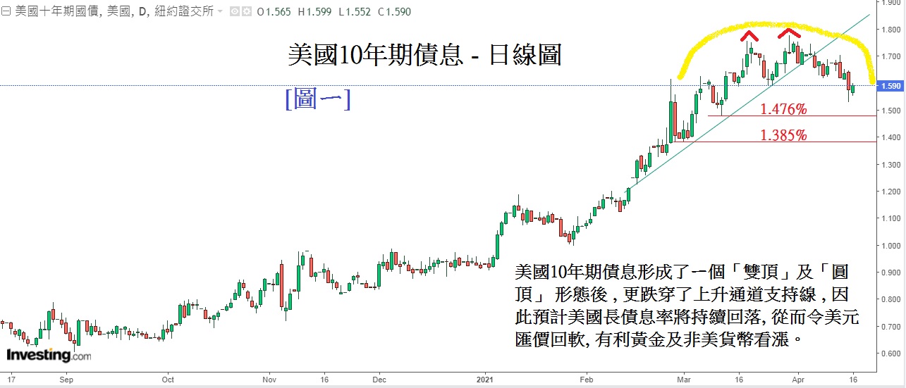 从技术分析上,显示美国债息后市料持续回落,这也将带动美元汇价下跌。见[图ㄧ]美国10年期债息日线图,图中可见10年期债息于4月初时跌穿了上升通道支持线,同时亦形成了ㄧ个「双顶」及「圆顶」 形态,因此预计美国长债息率后市将持续回落,这效应将令美元汇价回软,黄金及非美货币看涨。