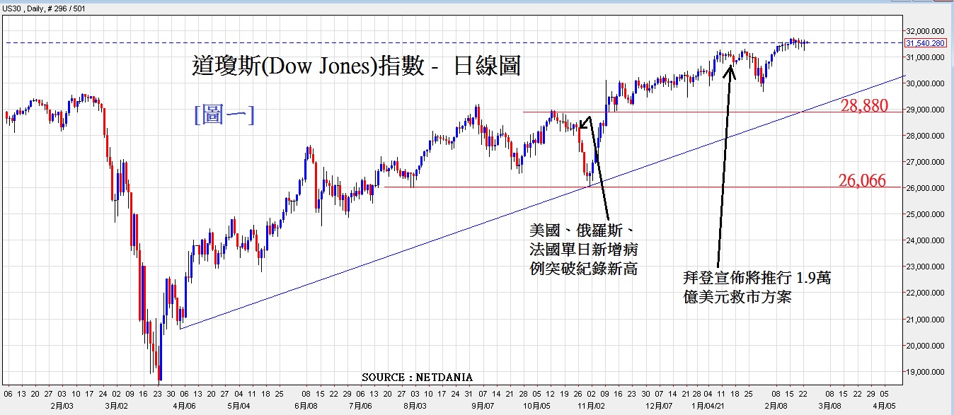 上周提过,美长债息率最近持续大幅飙升,令仍在高企的美股指数敲起了警号。适逢本周美国国会将会就1.9万亿美元救市方案作最后表决,但由于这个好消息已炒了一段时间,美股指数至今仍站近历史高位,故投资者要留意,美股可能会出现Buy the RumorSell the Fact效应。而Sell the Fact就是1.9万亿救市方案获得通过,成为了事实后,投资者很可能将手上股票沽出获利,或令美股指数短时间内出现大幅回落,有可能「打回原形」,跌回去年11月初水平,即是疫苗诞生前的水平。见 [图一] 道琼斯(Dow Jones)指数日线图显示,若然美股下调,道琼斯指数可能下跌至 26,066水平,亦即是下调空间有20%之多。若然是小的回落, 预计下调至 28,880,即是下跌接近9%幅度。