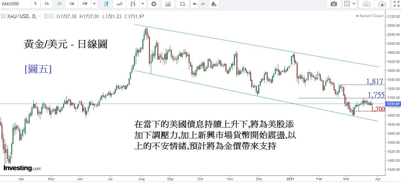 见[图五] 黄金/美元日线图,现时黄金仍在大型下降通道内游走,预计市场不安情绪将令金价上升。