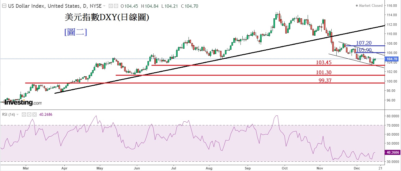 见下方[图二]美元指数DXY(日线图),图中可见美元指数在11月初跌破了大型上升趋势线(黑色粗线显示)后,现正循住小型下降通道(两条黑色幼线显示)向下拾级而落,短期内美元指数或仍有少许上升动力,但小型下降通道的顶部,即105.90料将限制美元升势。长线而言,美元走势仍然看跌。