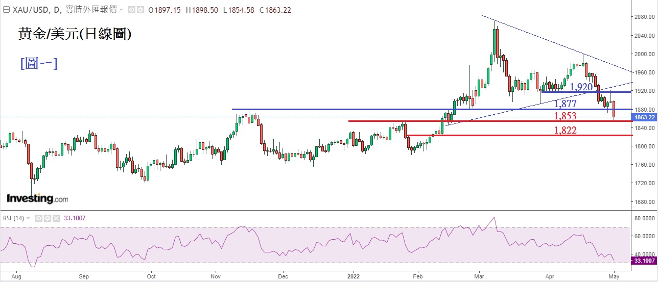 见下方[图ㄧ]黄金/美元(日线图),受到美联储局或在本周四(5日)加息0.5%下,刺激美元汇价上升,令金价下跌。上周金价跌破了三角形底部,本周内料金价仍下探,留意下方两个支持位,分别是1,853及1,822。
