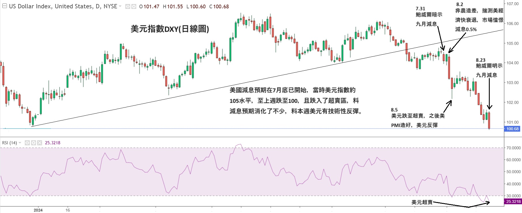 虽然美国减息预期再升温,但值得注意的,可参考下方美元指数图表显示,九月减息预期升温已从七月底八初开始了,当时美元指数高企近105水平,直至上周五晚跌至100.68收市,14日RSI指数是25,反映美元跌至超卖水平,也反映9月减息0.25%的预期已消化了不少,因此美元本周作技术反弹机会颇高,而且距离9月18日联储局议息仍有四星期,美国仍有多个重要数据等待公布,所以减息预期可能会随住数据结果出现变量,本周有三个美国重要经济数据公布,如下 :
