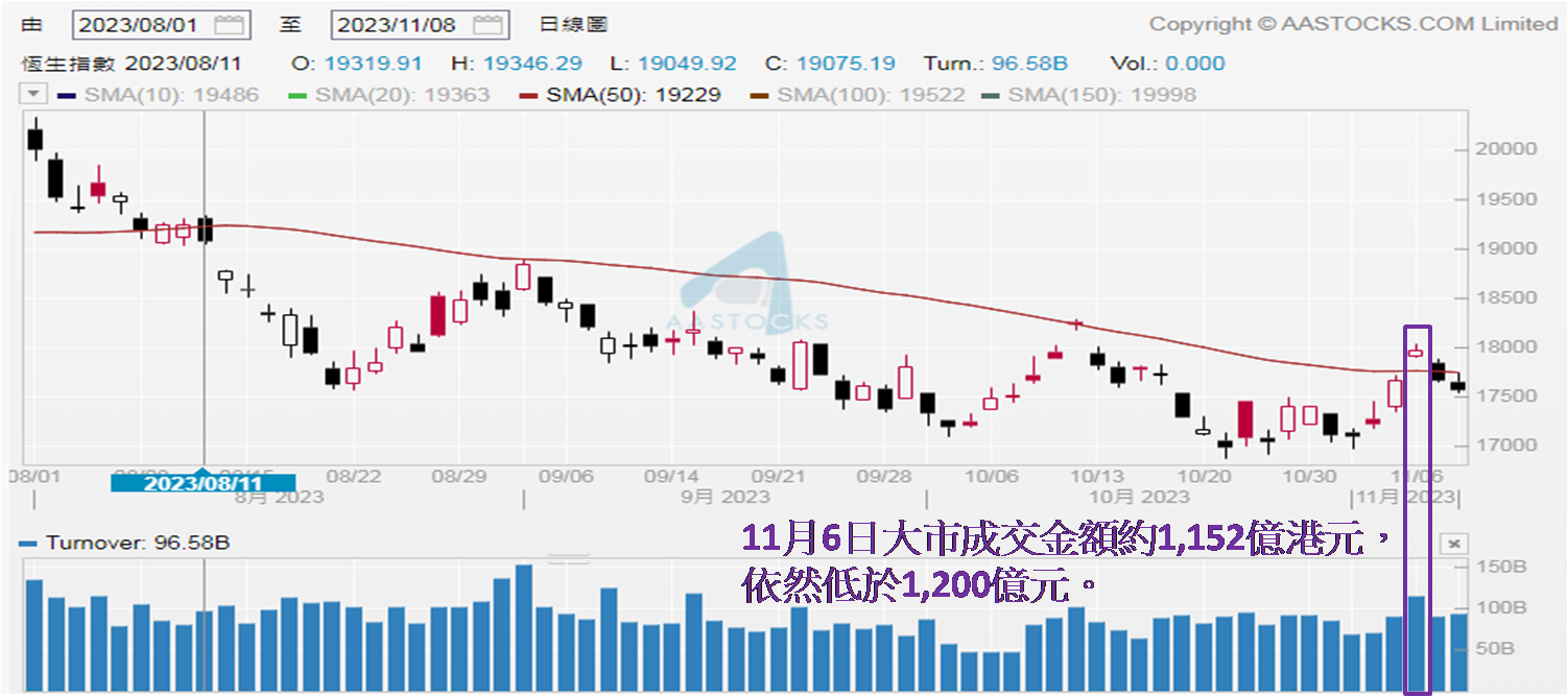 故此前文表示,相对11月1日收报17,101点,而潜在升幅约1,000点,参考目标便是18,100点;但11月6日高位为18,037点,未达18,100点。另外,前文又指出参考上述两次反弹浪,大市成交额分别由约1,000亿增至1,500亿港元,以及约500亿增至1,000亿元,同见相距约500亿元,至于11月1日成交额约700亿元,若增约500亿元,将见1,200亿元。于11月6日大市成交金额约1,152亿元,少于1,200亿元,由此推断港股上扬动力未达峰值,相信这亦是造淡大户 (卖方) 留意到的。既然造好一方 (买方) 仍有余力反攻,逻辑上造淡一方要静待出手时机。
