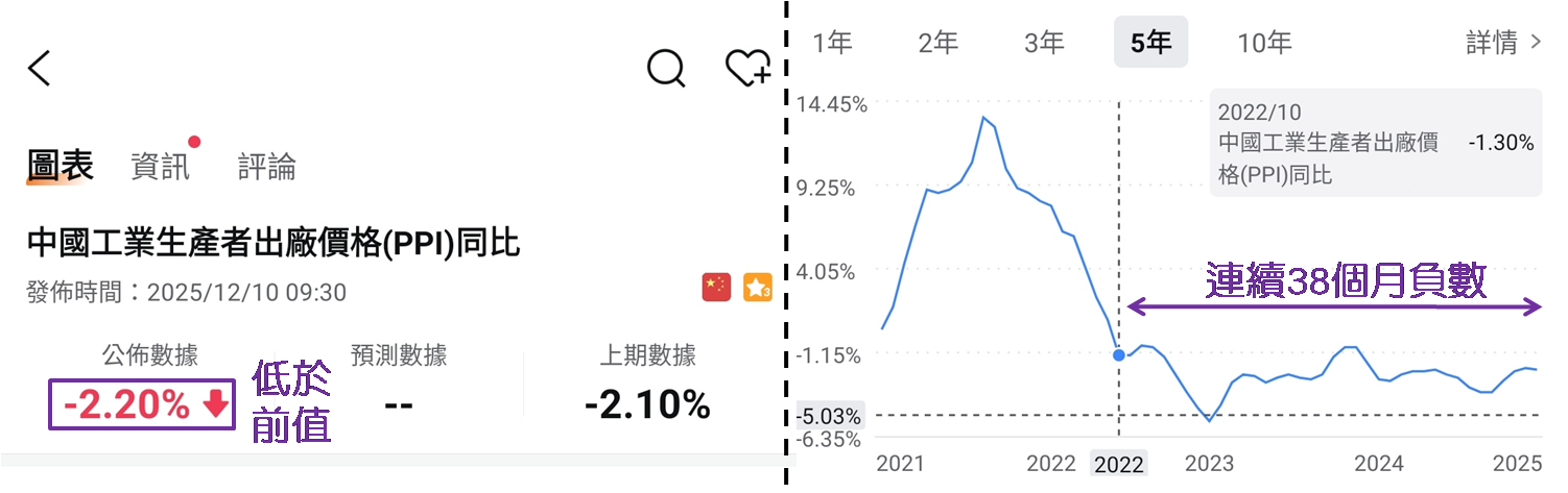 港股續走弱不排除與同一時間內地公佈11月生產者物價指數 (PPI) 有關,為 -2.2%,長達三十八個月錄得負數,亦較預期值 -2.0%及前值 -2.1%為低,官方解讀主要受上年同期對比基數走高影響。暫未見PPI在短期有轉正跡象,抵消CPI轉強因素,令港股繼續受壓。目前恆指已踏入第三日收低於100天移動平均線,亦較此線低逾300點,顯然可確認受制於此線。早於12月4日發佈市評文章時表示倘見確認100天線已成阻力位,配合大市交投續弱,相信恆指會「陰跌」,便要留意恆指於25,000至25,200點之間會否找到支持。