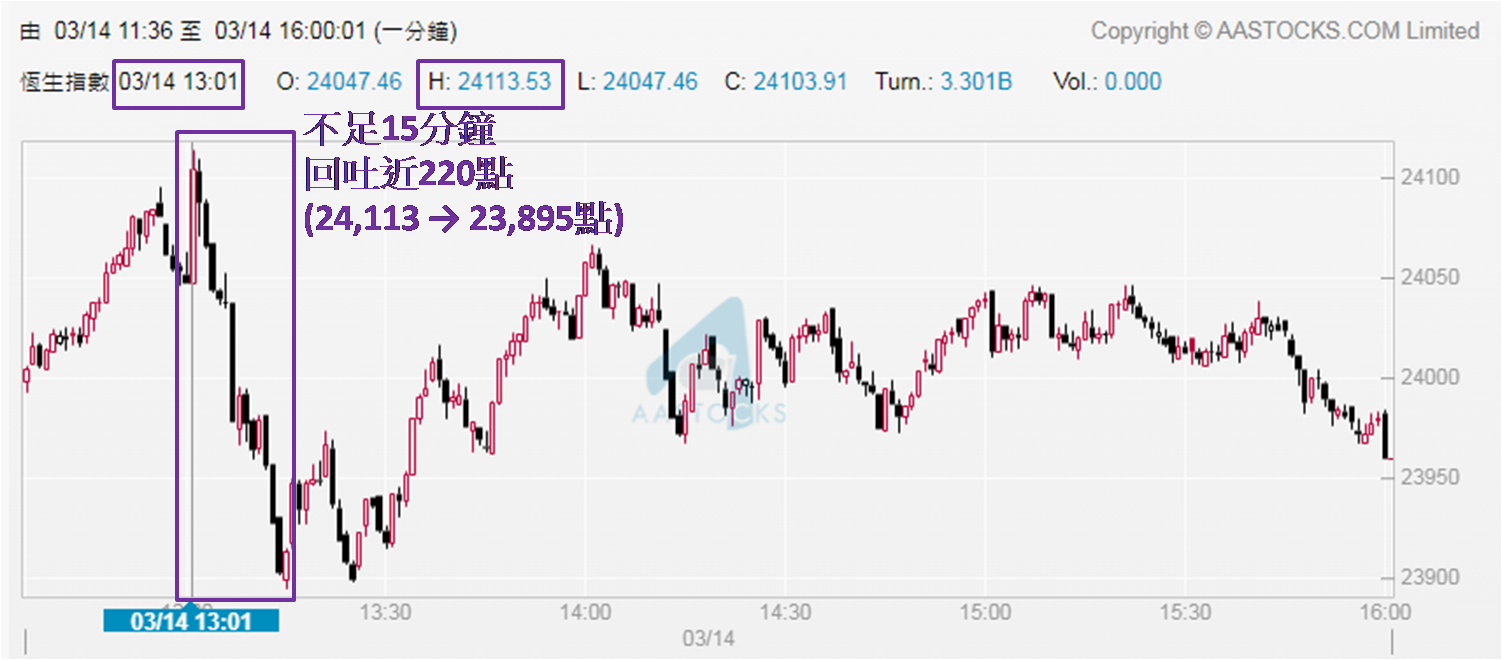 诚然交投活跃是「双刃剑」,于升市时故然能提供续升动力;但好淡角力出现时,程度也较激烈,于沽压出现时,动辄回吐往往是200点或以上。以上周五为例,就算全日大升近500点,不过从下午开市不足1分钟高见24,113点,便见回吐,短短15分钟内便低见23,895点,跌近220点。又可参考上周四上午收市前不足1小时高见23,712点 (升逾110点),下午开市约40分钟却低见23,198点,跌逾510点。故此从恒指现近24,000点,处逾三年高水平的大好形势,要是淡友窥准利淡消息出现时机发力,届时沽压不容小觑。