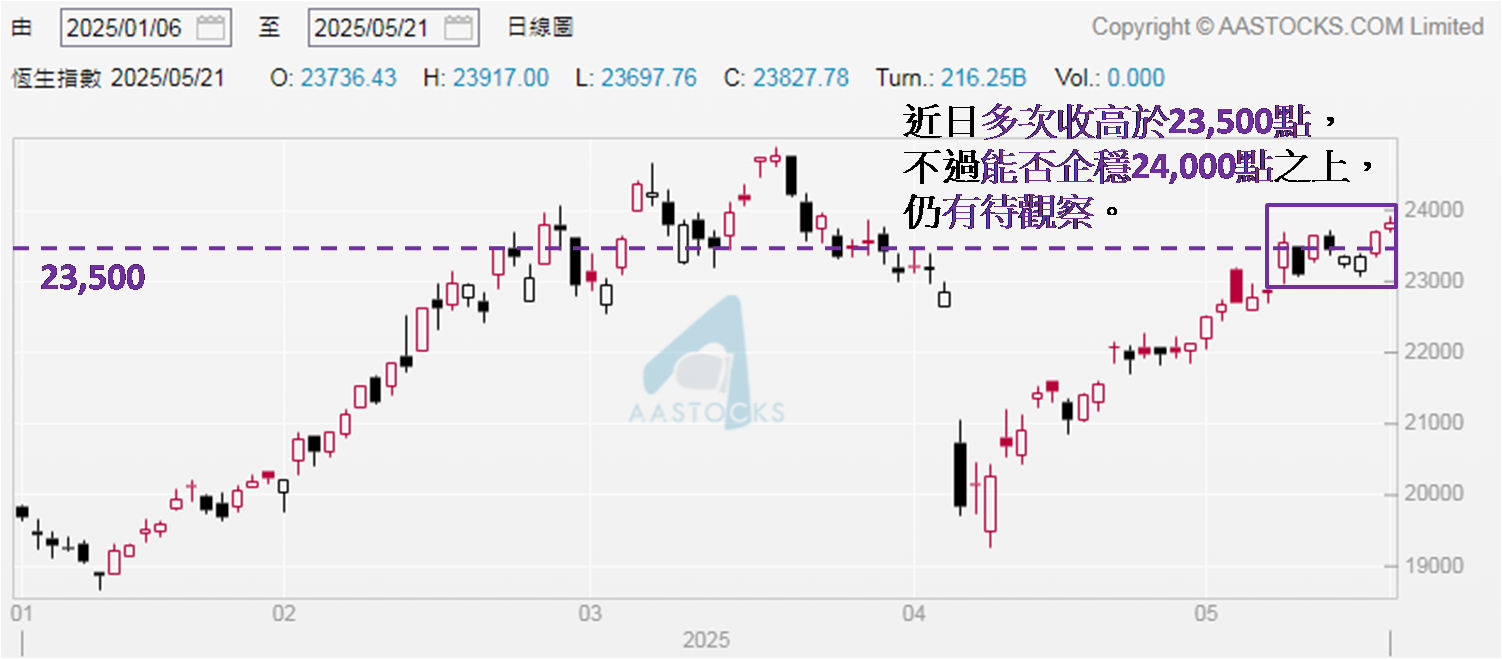 自5月12日中美联合宣布彼此关税暂缓实施90天的消息出现后,至今未见其他重大利好消息,故此从5月13至19日共五个交易日,其中四日见跌,恒指收市位普遍介乎23,100至23,500点之间,出现窄幅上落势态合理。不过随着5月20日收报23,681点,自4月7日因美国公布「对等关税」详情令环球股市震荡以来,连同5月12和14日分别收报23,549和23,640点,是第三度收高于23,500点,昨日恒指续升,显然已上破近期窄幅上落区间顶部。到底为何没有重大利好消息加持,港股仍在向好呢?