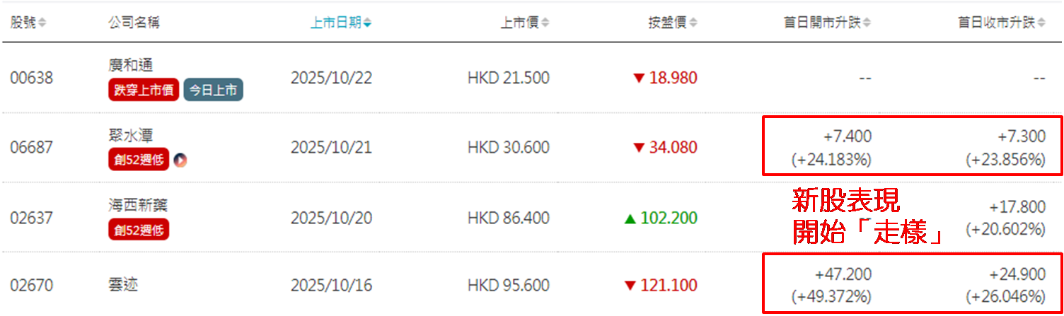 因着内地基本因素仍较稳健,本月余下时间中港股市大跌的可能性偏低,不过从港股的新股市场见微妙变化,后市宜多加留意。于10月16日上市的云迹 (2670),上市前一日暗盘最多曾较上市价高出超过一倍,收盘仅升约五成,上市首日更只升约26.00%。原定于10月17日上市的海西新药 (2637) 因需要额外时间完成新股分配的定稿及获取监管机构批准,延后一个交易日至10月20日上市,之前暗盘最多亦曾较上市价高出超过一倍,收盘仅升约两成半,上市首日更只升约20.00%。