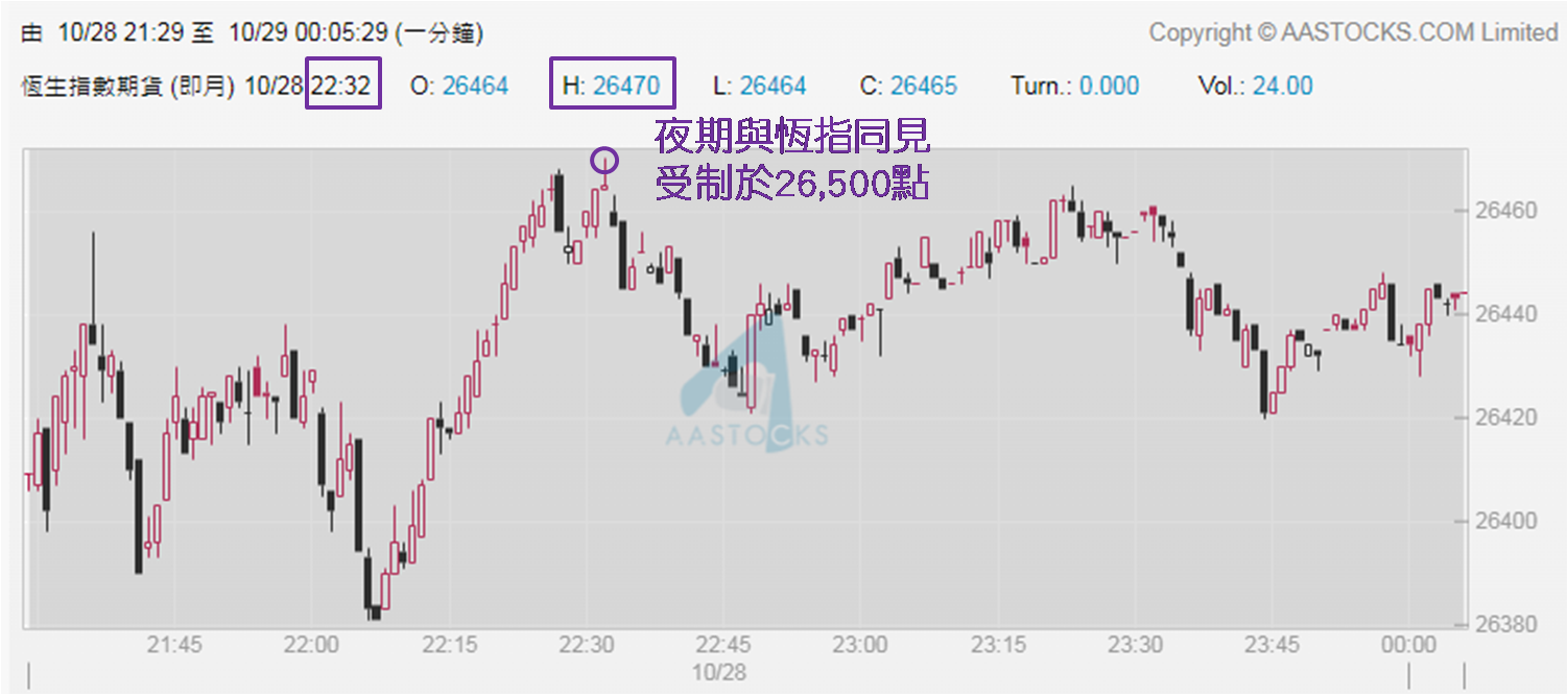 近日恒指走势出现有趣情况,于10月20至27日共六个交易日,有五日见升,但同期亦见五日「阴烛」,配合四日是升市。恒指上扬而收市位低于开市位,意味着近日较多投资者进行「逢高沽货」操作,此举会阻碍后市升势,所以10月28日恒指走势不难理解。开于26,508点,近乎全日高位26,519点 (见于开市首分钟),于开市第四分钟起,每分钟高位便低于26,500点。虽于上午10:50至下午1:04曾见高走行情;但期内仅高见26,493点,隐约在26,500点水平已形成阻力;于夜期亦见此情况。