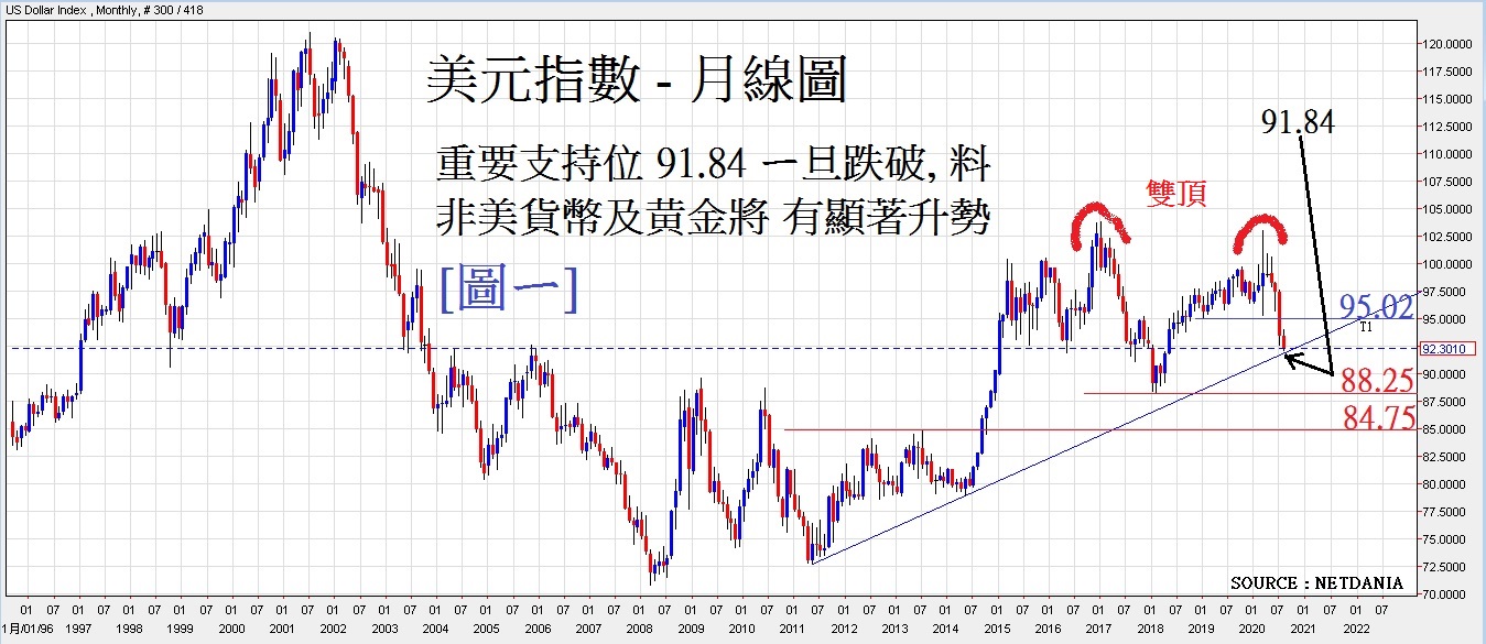 見[圖一]的美元指數月線圖,可見美元指數自2011年起, 一直維持游走在上升通道支持線之上,但上週收在92.30,已跌近支持線(91.84),情況看似有點「危危乎」的感覺,加上上面兩個高點,形成了「雙頂」, 加大了美元指數跌破支持線的可能。筆者認為,跌破的時間可能是本週或下週。這個維持了9年的上升通道,若然失守,預計非美貨幣及黃金將大幅攀升,因此本週應密切留意91.84能否守得住。