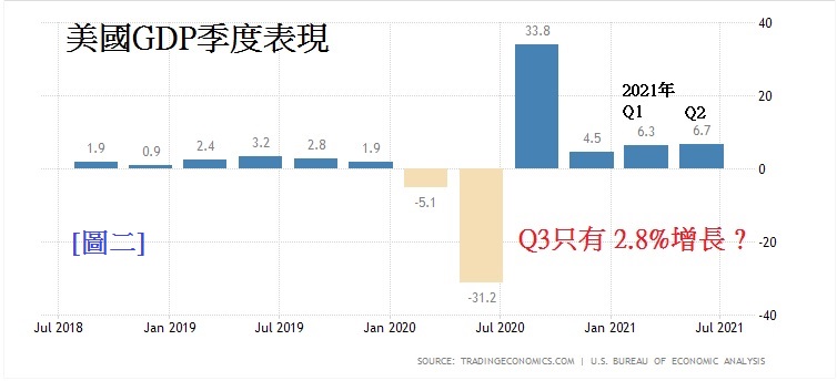 不過,因供全球應鏈問題影響下,導緻美國經濟在第3季表現下滑,見[圖二]美國季度GDP表現,今年首兩季均錄得6.3%及6.7 %GDP增長。本來是表現不俗,但由於美國疫情在第3季持續惡化,每日新增感染個案近10萬,影響了工業產出及供應鏈運作,導致經濟表現下滑,市場分析預計美國第3季GDP增長只有2.8%,大大低於次季的6.7%,這觸發了市場對美國或陷入「滯脹」的擔憂。因此本週美國GDP結果將會是全球市場焦點。 若第3季結果是2.8%或更低,預計美元將會顯著下跌,非美貨幣及金價料會有凌厲升勢,尤其是黄金,因「滯脹」帶來的風險下,避險資金將推升金價。美國經濟有多差勁,密切留意本週美國GDP結果。