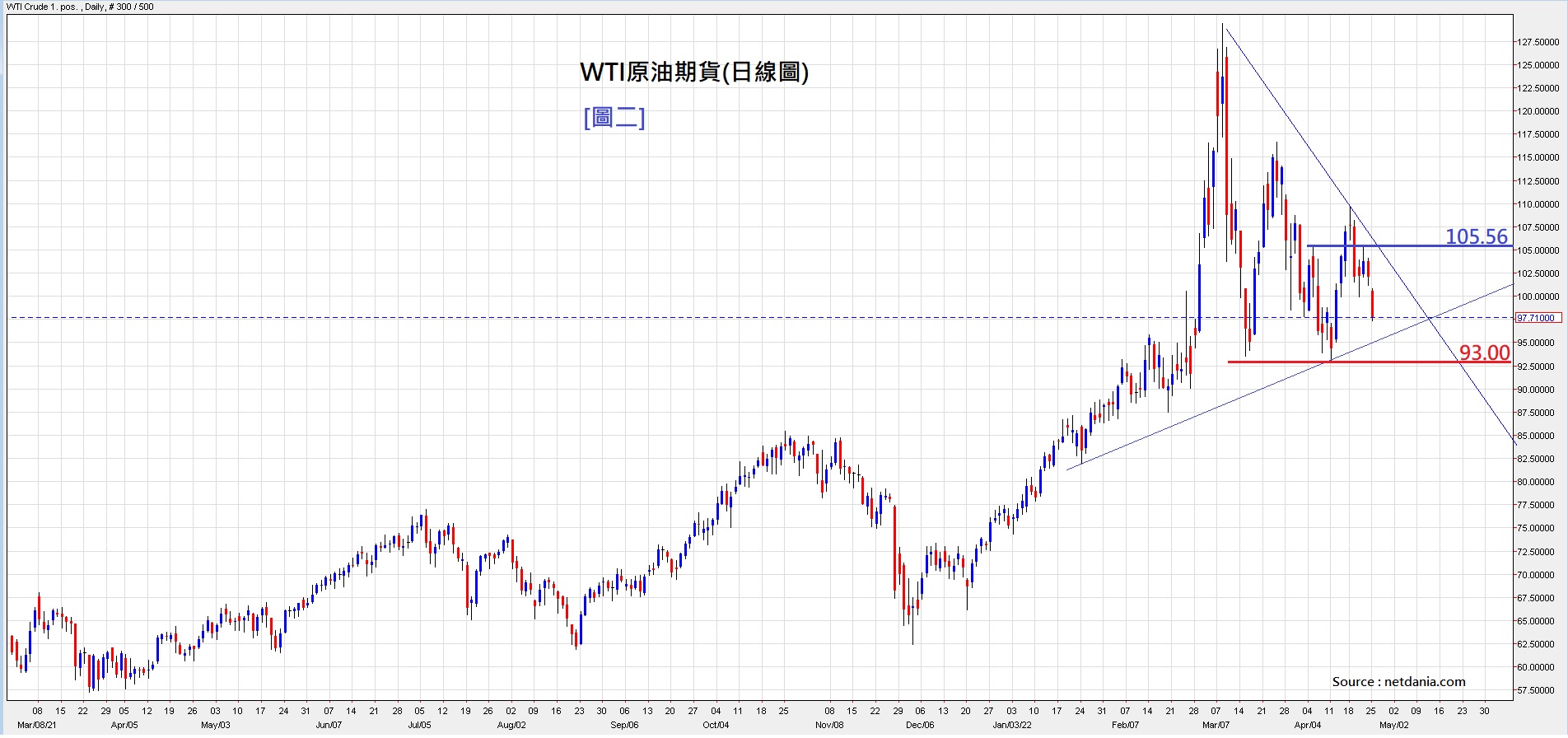 见下方[图二]WTI原油期货(日线图),目前油价仍在三角区内,本周预计油价仍然受压而回落;但俄、乌战争仍然战斗中,全球供应链仍然未完全回复正常。因此油价不应看得太淡;留意下方93美元/桶的重要支持位能否守得住。