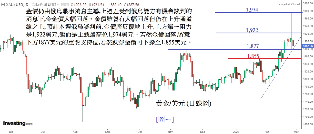 金價仍由俄、烏戰事消息主導,上週五受到俄、烏雙方有機會談判的消息下,金價大幅回落。見下方[圖ㄧ]黃金/美元日線圖,金價雖曾有大幅回落但仍在上升通道線之上, 預計本週俄、烏談判前, 金價將反覆地向上升, 上方第ㄧ阻力是1922美元,繼而是上週最高位1974美元。若金價回落,留意下方1877的重要支持位,若跌穿金價可下探至1855美元。