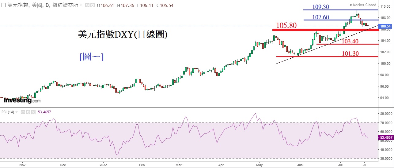 見下方[圖ㄧ]美元指數DXY(日線圖),藍線是上升阻力,紅線是下跌支持。