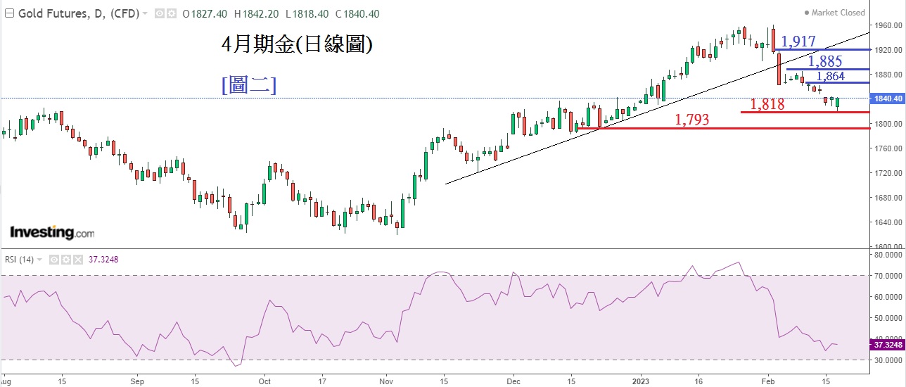 見下方[圖一]美元指數DXY(日線圖),上週二因美國CPI結果高於預測,令美元指數從102.60一直上升至週五,週五因聯儲局最鷹派官員布萊德(Bullard)表示或有機會在3月加息0.5%,美元指數一度曾升穿下降通道線(黑色幼線顯示),最高曾升至104.67,但收市前回落並在103.86收盤,返回下降通道線之下,暫時仍可界定為「未升穿」,可能是市場事後發覺到這位超級鷹派官員在今年並沒有投票權。