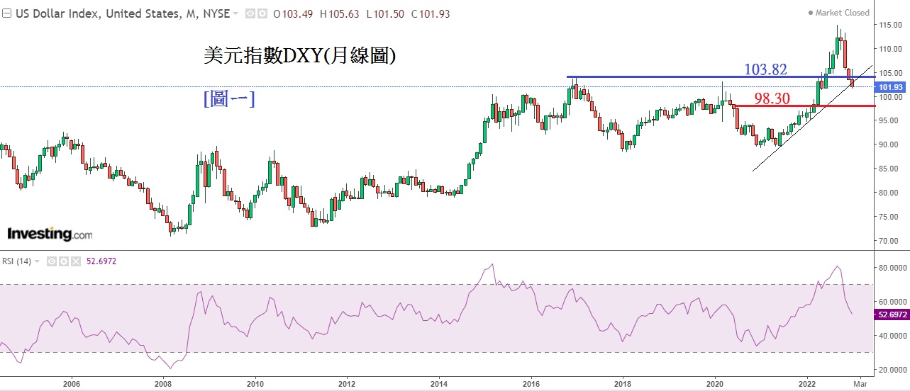 見下方[圖ㄧ]美元指數DXY(月線圖),今次用月線圖是因為可顯示到美元指數已跌破了2016年高位103.82,而本月的陰燭亦已跌破了上升通道線(黑色 幼線顯示)。從技術面看, 美元匯價後市預計會進一步下跌,意味著金價及非美貨幣料持續上升。