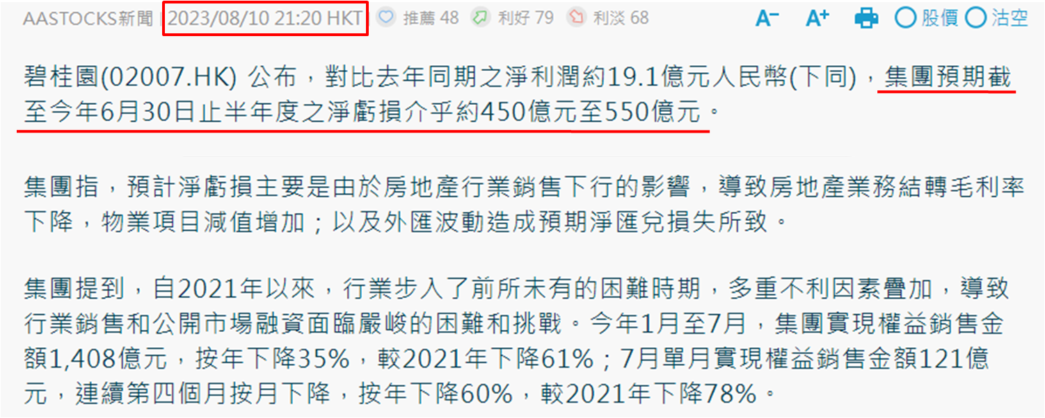 此股近期負面消息不絕,上周四晚上發盈警,預期2023上半年蝕450億至550億元 (人民幣,同下) (如下圖),早於2022全年經已逾60億元,市場憂慮集團基本面在惡化。不過集團指目前淨資產充足、土儲充裕,截至去年底,淨資產約3,096億元,總權益可售資源約12,083億元,其中已獲取的權益可售資源約9,555億元。筆者則留意截至去年底,於流動負債的優先票據、公司債券、可換股債券,以及銀行和其他借款合共約9,371萬元,與上述約9,555億元可售權益相若,推斷很大可能今年餘下日子集團要大量出售資產。