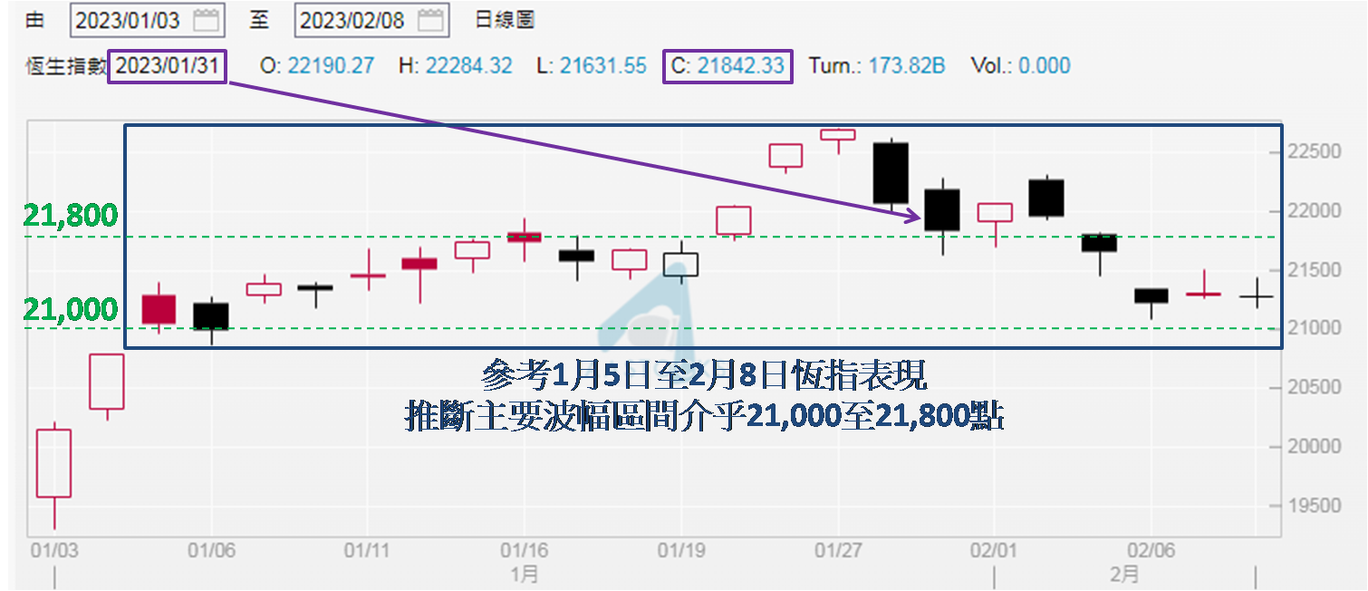 於早前內地防疫封控優化及中港通關消息均已被市場消化,而市場又沒有出現重大負面消息,筆者認為恆指繼續橫行整固機會大。從1月5日至2月8日歷時22個交易日,期內只有1月6日收低於21,000點,收報20,991點,因兩者差距僅9點,無異於處於21,000點水平;至於收高於22,000點則有五個交易日 (1月20至30日,以及2月1日)。餘下16個交易日佔22日超過七成二的日子,收市位屬主要波幅區間參考,介乎21,052至21,842點,推斷恆指若斷續守在21,000點之上,將於21,000至21,800點之間擺動 (如下圖)。