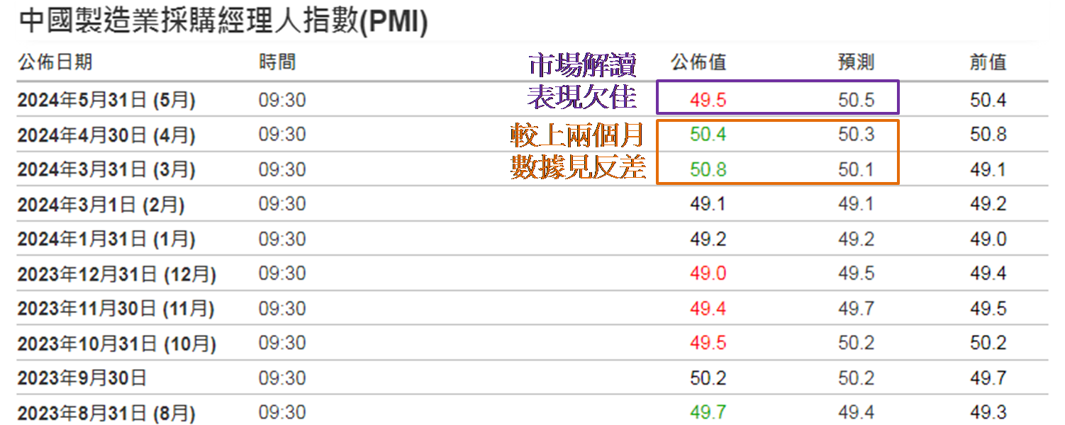 而於上午9:59起,PMI數據表現才逐漸反映到港股之上,5月數字為49.5,低於預期的50.5,與3月和4月均高於預期出現反差。另可留意49.5是近三個月最低,亦低於50.0的盛衰分界線,市場重新關注內地經濟增長有否放緩壓力。國家統計局表示受前期製造業增長較快形成較高基數,和有效需求不足因素影響,製造業景氣水平回落,非製造業 (公佈值51.1,雖高於50.0,卻低於預期的51.5) 則繼續保持擴張。筆者則認為市場負面解讀略嫌有點過頭,本身5月有「五‧一黃金週」長假期因素,所以6月數據若繼續放緩,才對內地經濟前景感憂慮較合宜。