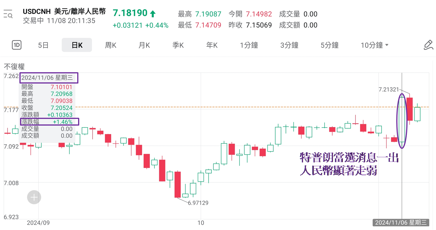 其實特朗普要到2025年1月20日才上任,距今超過兩個月,到底上述「連瑣推測」會否成事,筆者認為言之尚早。值得留意現時的強美元格局,特朗普未必樂見,於2017至2020年在任總統期間,主張「弱美元」方向,當時多次在公開場合指人民幣不合理地低,持續向中國施壓要求人民幣升值。當時人民幣絕大部份時間處於「七算」以下,如今離岸價卻在7.17000之上。而近年見離岸價高企是在7.30000之上,較7.17000人民幣貶值近1.80%,如此水平絕對不利美國出口,就算特朗普大幅加徵中國進口貨關稅,也會被「弱人民幣」顯著抵銷。