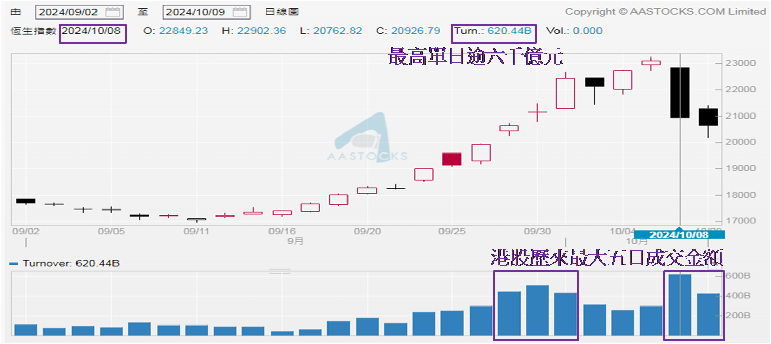 當時筆者亦已表示年初至10月4日收市恆指累升33.37%,與2017年升35.99%相若,當時是自2010年以來最大升幅年份,所以不論恆指能否成功上試23,000點,單是截至10月4日就2024年來說經已是最近十五年表現顯著為佳的一年,理性而言不宜對後續升幅有太大期望。再看現在,倘若從10月3日至今一直未有減持或止賺離場,筆者認為應有兩手準備,其一是恆指下方以20,000點作最後防線,若見失守收市應果斷止蝕離場。皆因自9月24日港股上揚以來,期間未見任何橫行區,意味著沒有支持位參考,實則20,000點只是心理關口而已。