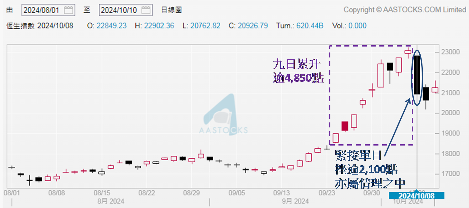 自9月30日恆指於陰陽燭日線圖出現「十字星」後,走勢波動,雖於10月7日高見23,241點,為2022年2月25日以來最高;兩日後卻低見20,190點,險守二萬關口,高低波幅超過3,050點。市場傾向認為與10月8日發改委於記者招待會上發表的內容較大眾期待的有很大落差,令早前港股升勢顯著窒礙,當日恆指瀉逾2,100點,跌幅逾9.40%,為2008年10月28日以來最大單日跌幅,亦是踏入千禧以來第二大單日跌幅;期內第三大跌幅見於美國911恐襲翌日 (2001年9月12日),恆指下挫8.87%。
