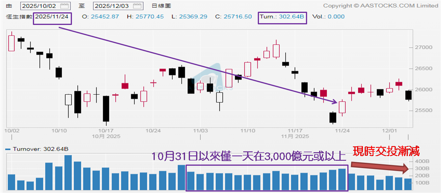 從11月25日至12月3日歷時七個交易日,恆指收市位介乎25,760至26,095點,相距僅約335點,並且繼本周一和周二 (12月1和2日) 見二連升後,周三止步跌逾330點,收報25,760點,為11月25日以來最低,也是期內首度收低於二萬六關口。而本週過三個交易日大市成交金額分別約2,008億、1,782億和1,644億港元,除了漸見減少,也是連續兩日少於2,000億元。自11月24日錄得約3,026億港元,是10月31日至今惟一超過3,000億元的日子,繼而出現減少趨勢,上周三 (11月26日) 降至約2,071億元,相距兩日竟減近千億元。及後於上周五、本周二和周三分別錄得約1,462億、1,782億和1,644億元。