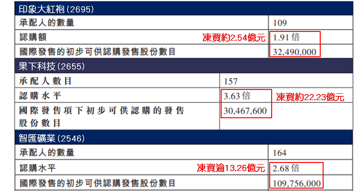 究其原因此股的國際配售認購率為1.91倍,上週上市並熱炒的果下科技 (2655) 和智匯礦業 (2546) 則為3.63和2.68倍,後者也較1.91倍高出超過四成,於國際配售凍資超過13.26億元;而印象大紅袍僅凍資約2.54億元,進一步確認此股的國際配售認購率偏低,初步反應此股缺乏大戶承托,單靠散戶不足以推升股價。另看上周五上市的希迪智駕 (3881),在招股規模不足541萬股的情況下,公開發售認購率僅22.55倍,認購反應冷淡,上市首日跌13.69%不難理解;國際配售認購率則見2.10倍,凍資超過28.37億元。