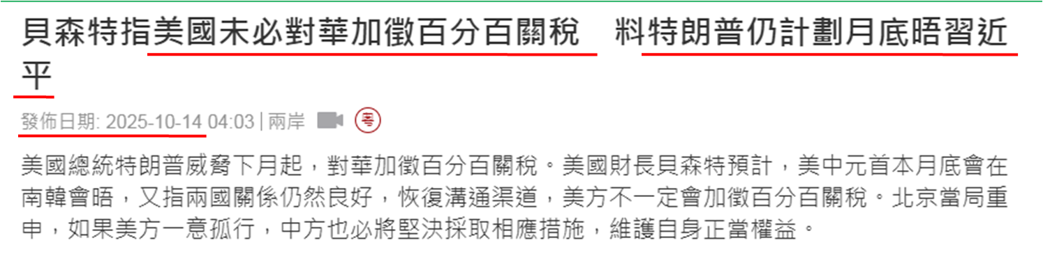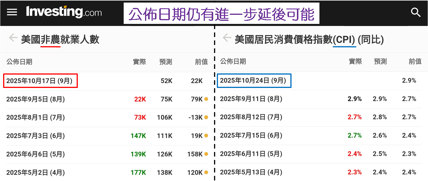 不過民主共和兩黨在醫療補貼議題上立場均見強硬,「停擺」延續至下週可能性為高,若推斷正確,非農數據公佈日期要進一步延至10月24日。此外,一般在每月15號或之前公佈的美國CPI,現時亦已延至10月24日才公佈。值得留意聯儲局下次議息日期為10月29日,要是非農數據和CPI均未能在10月24日公佈,意味著聯儲局要在缺乏最新就業及物價數據下製訂利率路徑,將對美國經濟調控帶來影響。而面對停擺停入第三週,財長貝森特在接受福斯商業頻道訪問談到停擺一事時表示:「情況越來越嚴重,開始影響實體經濟。」